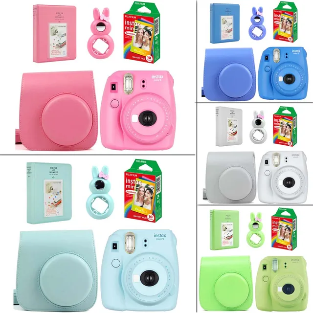 Best Offers 5 Colors Fujifilm Instax Mini 9 Instant Photo Camera Set with Rainbow Film+Leather Camera Case+Photo Album+Rabbit Selfie Lens